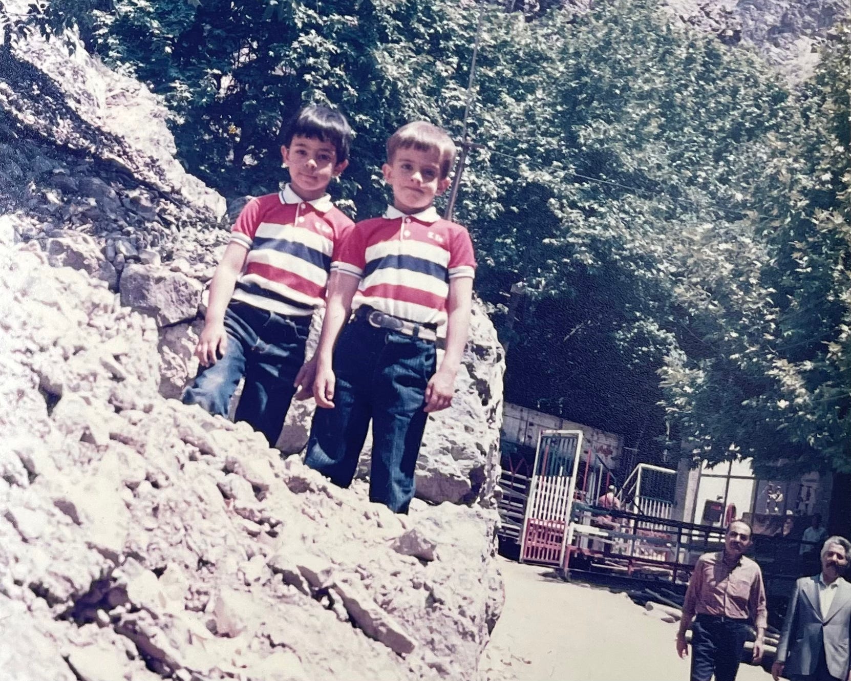 The days that follow are a blur. We visit the bazaar, gripping our parents’ hands as we are led through vaulted passages, peering through gaps in the crowd to catch glimpses of old men bent double by boxes, spears of sunlight penetrating holes in the brickwork. We take a taxi to where the city gives way to the Alborz mountains and spend a day hiking, crossing rapids on terrifying log bridges. We stop in a tea shack straddling a waterfall, sip cokes on a carpeted day bed while dad struggles to smoke a shisha. Everywhere we go I am amazed by the looks we get from locals; here it is my English mother and fair-skinned brother who are the subject of stares and muttering from passers-by.